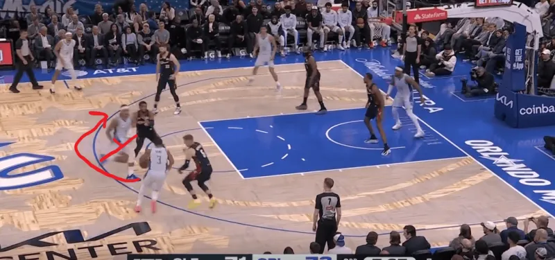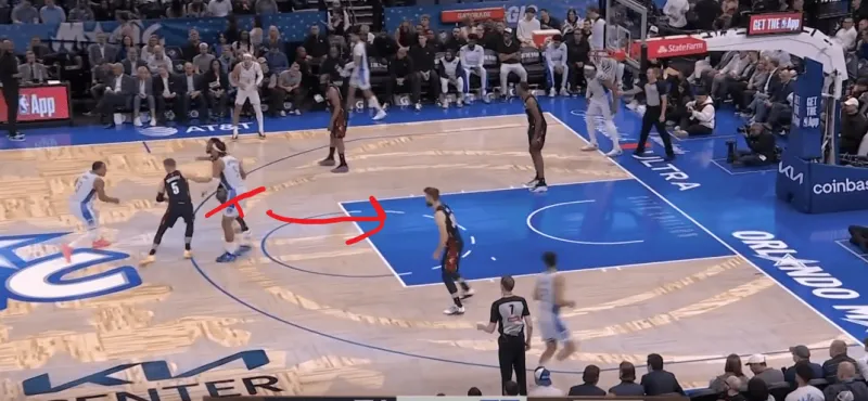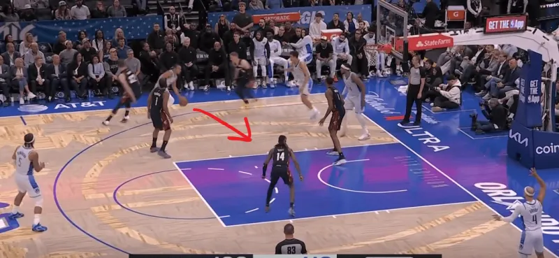 反过来,贝恩持球时,哈登在左侧刷卡,贝恩迅速单手出给接应的班凯罗,后者直接加速启动突破回收补防的哈登突破完成终结: