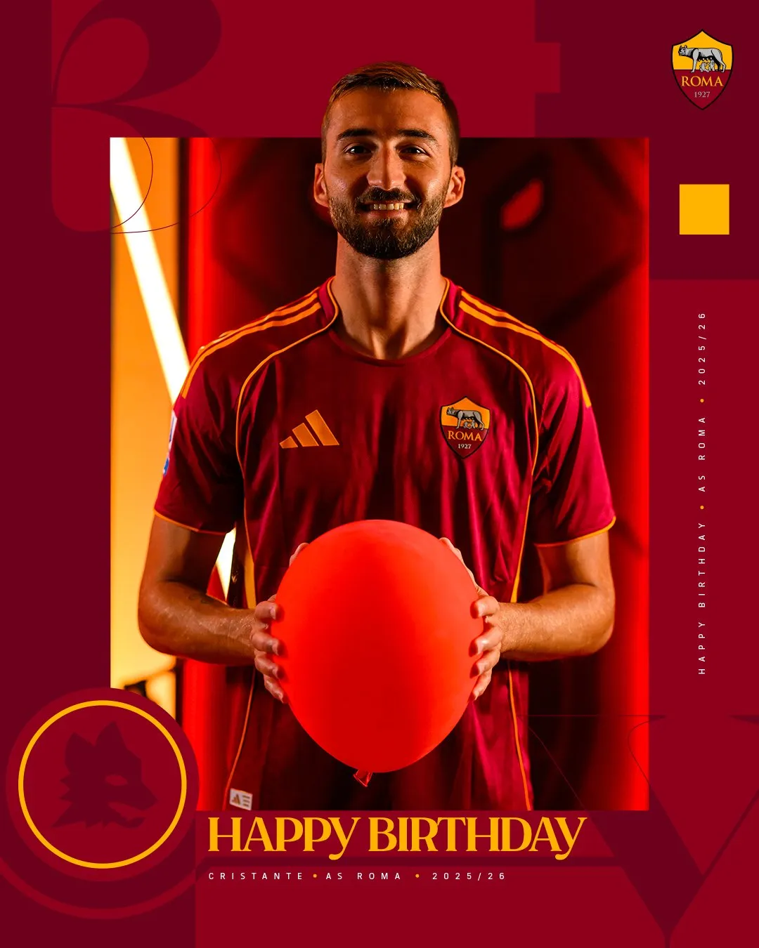 虎扑03月03日讯 克里斯坦特今天迎来了自己的31岁生日,罗马官方社媒发布海报并配文:生日快乐,布莱恩!