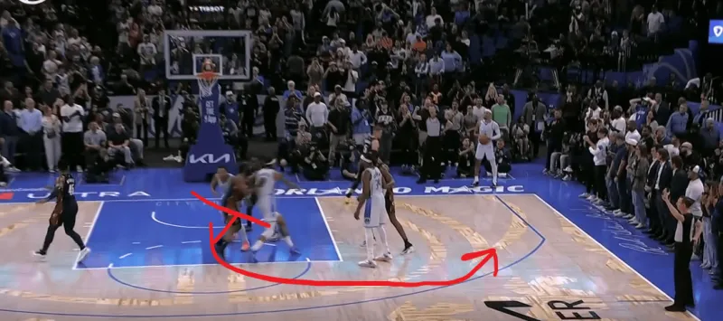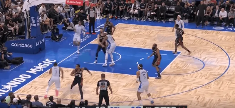 反过来,贝恩持球时,哈登在左侧刷卡,贝恩迅速单手出给接应的班凯罗,后者直接加速启动突破回收补防的哈登突破完成终结: